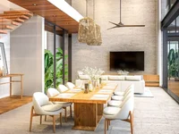 The villa is decorated in a luxurious tropical style and features a spacious open-plan living and dining area with double high ceilings, as well as a modern Western-style kitchen.