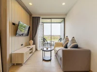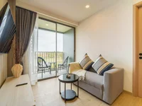 The apartment is on a spacious side, with lots of room. There is a walk-in wardrobe that connects the bedroom and bathroom. There is plenty of space in the living room and balcony that allows you to enjoy the gorgeous view of green hills, golf court, and houses of the Bang Tao area.