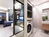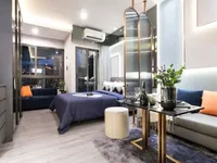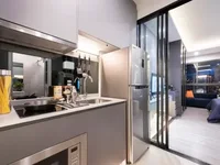 Compact but Thoughtfully DesignedThis 31 sqm condo is a great fit if you're looking for something modern and easy to maintain in the heart of Bangkok's Phra Khanong area. The open-plan layout means you don't feel cramped—the kitchen, living, and sleeping areas flow nicely into one another, yet the sliding glass doors give you some separation when you want it.Kitchen and LivingThe kitchen is surprisingly well-equipped for its size, with sleek cabinetry, an induction cooktop, built-in microwave, and handy overhead vent hood—all the essentials for cooking at home. Right next to it is a cozy laundry space with a washing machine and storage shelves above, which keeps things convenient but hidden.Comfort and StyleWood floors and recessed ceiling lights give the place a warm, modern feel. The living area has a sofa and a small dining table with a tasteful glass or marble top and gold legs—nice touches that show attention to detail. Large windows flood the room with natural light and offer views of the bustling city skyline, which you’ll appreciate especially in the evenings.The bathroom feels quite polished with its glass shower door and wall-mounted vanity. There's even built-in shelving and a dark gray wardrobe with reflective doors to maximize storage without feeling bulky. Plus, the air-con unit mounted above the bed ensures you'll stay cool year-round.All in all, this feels like a smart, move-in-ready spot if you want to be close to city conveniences without compromising on style or practicality.