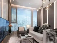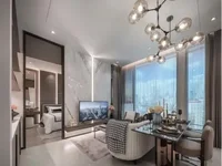 Chill in a Contemporary, Light-Filled SpaceThis 45 sqm condo has a really easy, open feel—especially with those large floor-to-ceiling windows that let in tons of natural light while giving you a nice cityscape view. You’ll probably spend most of your time in the open-plan living and dining area, which strikes a great balance between cozy and stylish. The room features a comfy white sofa paired with a gray armchair, plus patterned throws and soft rugs that make the space feel inviting without being fussy.Thoughtful Details That Make a DifferenceIt’s all designed with a neutral palette—mostly gray, white, and beige tones—so it feels modern but timeless. I like the marble accent wall and the vertical lighting, which add personality without overwhelming the space. Built-in shelving with accent lighting gives you a nice spot to show off decor or books, and the recessed ceiling and chandelier lighting create a warm ambiance at night.The glass-top dining table seats four comfortably, perfect if you like to entertain or just want a good dinner spot with a view. Curtains include both sheer and blackout options, so you can control the light however you want.Overall, this condo offers a practical, stylish home with freehold ownership right in the heart of Khlong Tan Nuea. It’s move-in ready and feels both airy and intimate at the same time.
