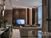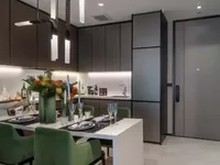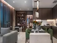 Feel right at home in this thoughtfully designed 2-bedroom condo in Khlong Tan Nuea.The open-plan layout really makes the most of the 72 sqm space, with the living room, dining area, and kitchen flowing seamlessly together. Large floor-to-ceiling windows bring in lots of natural light and give you a great cityscape view, perfect for relaxing evenings or entertaining friends.The living area is comfortably furnished with a gray upholstered sofa and armchair, anchored by a soft area rug that adds warmth to the neutral-toned tile floor. The dining space is genuinely inviting, featuring a marble table set with six green upholstered chairs and contemporary pendant lighting that adds a bit of style without feeling over the top.In the kitchen, you’ll appreciate the modern touches like under-cabinet lighting, white countertops, and dark cabinetry, plus integrated appliances that keep everything sleek and uncluttered. Storage’s handled nicely with built-in shelves filled with books and decorative pieces, and there’s even a secure entry door near the kitchen, which adds a practical touch.Both bedrooms come with their own bathrooms, so privacy isn’t an issue, and the overall minimalist design with clean lines and subtle wood paneling with illuminated black marble accents keeps the space feeling contemporary and polished.