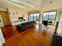 Bright, Open Living with Stunning ViewsThis 183 sqm condo feels really open and airy, mainly thanks to the large floor-to-ceiling sliding glass doors in the living room that flood the space with natural light. You’ll likely spend a lot of time here, especially with the black leather sectional sofa and extra futon providing plenty of spots to relax or entertain. The polished hardwood floors and neutral walls make the space feel warm and inviting without being over the top.Balcony and OutdoorsThe balcony is a real highlight: wooden flooring, glass and metal railings, a ceiling fan, and enough room for outdoor seating. From up here on the 18th floor, you get a panoramic view not only of the bustling Bangkok cityscape but also of a lovely green park with walking paths and a lake. It’s a rare blend of urban energy and nature, all visible from your home.Kitchen and Work SpaceThe kitchen flows straight into the living and dining areas, featuring a sleek black granite island topped with two modern pendant lights. White cabinetry and stainless steel appliances keep it looking modern and clean. Plus, there’s a dedicated workstation by the window—great if you need to work from home or study with natural light coming in.All in all, this is a practical, stylish place with a great layout and some genuinely peaceful views, right in the heart of Khlong Toei.