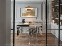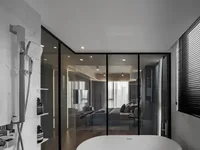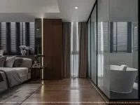 Layout and Living SpaceThis unit gives you a really open, airy feel with its open-plan living and dining setup. You'll likely spend most of your time here—there’s a dining table that comfortably seats six, perfect for hosting, and a sleek wall-mounted TV paired with a minimalist entertainment unit that keeps things feeling uncluttered. The wooden flooring and decorative ceiling light add warmth and a subtle touch of elegance, while the large window lets in plenty of natural light filtered through those floor-to-ceiling curtains.Style and PracticalityThe decor leans contemporary with a neutral palette that's easy to personalize, complemented by tasteful wall panels and some fresh greenery that gives the space life without overpowering it. There’s a modern study tucked away with a striped black and white desk featuring gold accents, a patterned chair with transparent legs, and built-in shelves—ideal if you work from home or need a quiet spot for reading.Bedrooms and BathroomsThe bedrooms are spacious and comfortable. Picture a large bed loaded with pillows, dark blinds that are great for sleeping in, and a glass partition that separates the bedroom from the bathroom area, giving it an open yet private feel. The bathroom itself is impressive: a freestanding white tub, a walk-in shower with rainfall and handheld heads enclosed in glass, marble tile walls, and a floating vanity with a wooden cabinet that’s both stylish and practical.