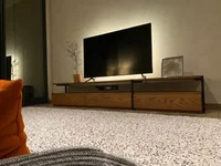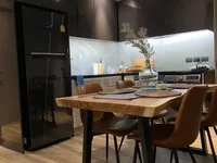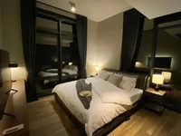 A relaxed, modern space with great city vibesThis two-bedroom, one-bath condo sits pretty high up on the 26th floor, so you get these amazing panoramic views of Bangkok’s city lights—especially impressive at dusk. The layout’s open-concept, so your living and dining areas flow nicely together. You’ll probably spend most of your time here, kicking back on the tan leather sofa with some cushions and throws, or dining around a beautiful wooden table that has this unique live-edge design, paired with comfy brown leather chairs. The floor lamp nearby adds soft, warm lighting that makes the space feel cozy in the evenings.Wood plank flooring runs throughout, giving a warm, natural touch, and neutral wall colors keep everything feeling calm and modern. The kitchen’s sleek and practical, with black glossy upper cabinets and wood lower ones, a built-in electric stove, and neat under-cabinet lighting that brightens the stone-textured backsplash. It’s compact but thoughtfully designed for everyday cooking.The bedroom’s a real highlight—big windows with blackout curtains, a comfy double bed dressed in crisp white linens, and warm ambient lighting from bedside lamps. Storage’s generous with a dark, sleek wardrobe, and the bathroom feels quite luxe with both a bathtub and a separate rain shower, modern fixtures, and natural beige tiles.Out on the balcony, you’ve got a small set-up with wireframe chairs and a table—perfect for a quiet morning coffee or winding down while watching the city buzz below. Overall, it’s a great blend of modern comfort and city energy in one, freehold condo.