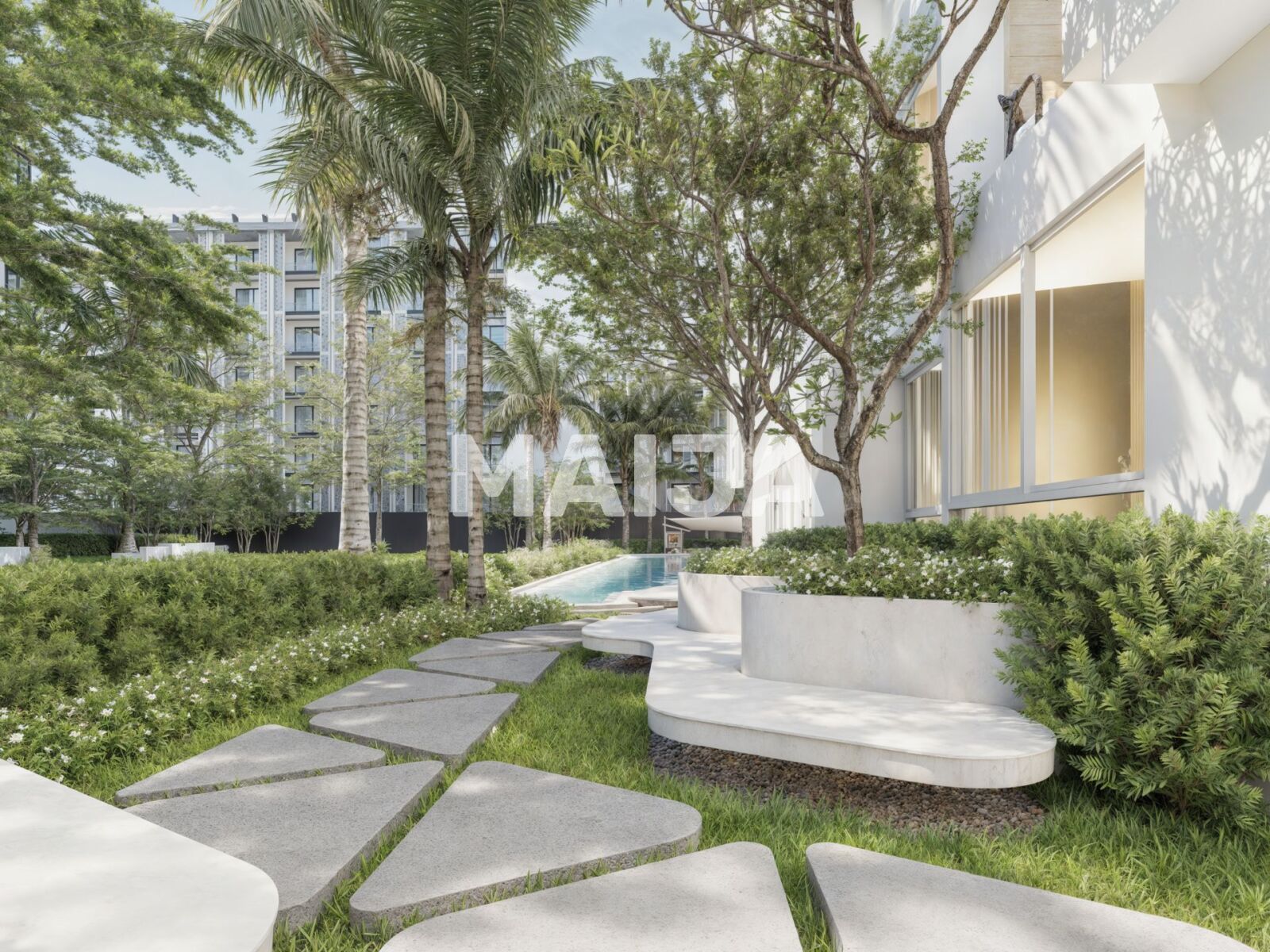 ✅ Two 7-story buildings with 171 apartments, total area 7,000 m², surround a courtyard with garden and pool. Layout ensures comfort with parking on lower floors. Space logic suits living or rental; buying apartments in this project is profitable next to Utopia Dream and Utopia Loft.