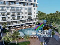 The flats for sale in Alanya, Turkey are situated in a 10-storey block. The project offers various amenities for the residents. Inside the complex, there is an outdoor swimming pool, aqua park, sunbathing areas, gazebos, barbeque areas, a sauna, a fitness center, a shock pool, and game rooms for adults and children. Additionally, the project is enriched with indoor parking, generators, security cameras, satellite TVs, and a lift.