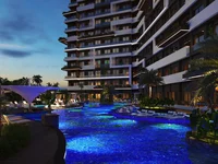 The luxurious complex offers a basketball court, a botanical garden, a tennis court, a heated swimming pool, an outdoor swimming pool, a lobby, a communal garden, karaoke, shuffle service to the beach, a gym, a playground, a conference room, a sauna, indoor parking, generator, security, security cameras, sound insulation, apartment attendant, and 2 lifts.