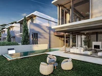 The spacious five-bedroom villas feature a living room, a separate or open-plan kitchen, an entrance hall, a WC, a winter garden, 3 en-suite bathrooms, a dressing room, a laundry-ironing room, and a terrace. Additional features include air conditioning in every room, internet infrastructure, a shower cabin, a built-in kitchen, electric blinds, satellite TV infrastructure, underfloor heating, a hobby garden, a heat pump, a dishwasher, a microwave, and storage space.