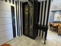 Lighting: A bold red chandelier becomes the room’s exclamation point—distinct and memorable. In addition ,spotlights and concealed LED strips distribute soft, even light for evenings at home, giving the apartment a relaxed, contemporary glow.