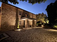 The stone villa features a private swimming pool, a gazebo area, a storage space, and a covered parking area for two vehicles.The garden features cobbled stone walkways, and the entrance showcases fine stone craftsmanship. It has natural stone facade, wooden pergola details, and large glass openings.