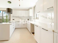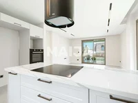 The villa features a fully equipped kitchen with oven, induction stove, cabinetry, and kitchen hood, as well as a washing machine connection. Additional storage space is provided by a walk-in closet and wardrobe.