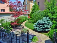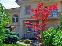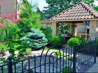The marble staircase with a rug, facade and fence around the house is finished with marble crumbs. All tracks, access to the house are made of natural stone. On the territory of the house: two active waterfalls, barbecue, a big gazebo. Large rose garden, coniferous trees, phytodesign of the site.