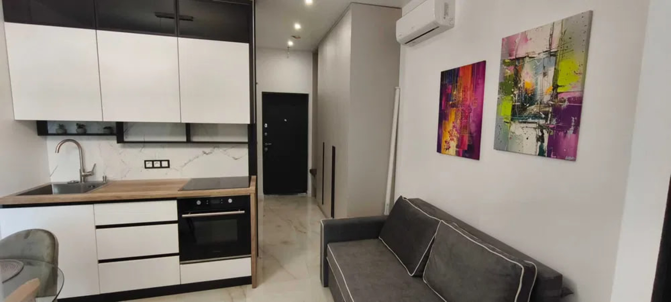 Fully equipped with furniture and appliances - everything remains for new owners. A modern kitchen, household appliances, air conditioning, stylish lighting and spacious storage systems are installed.