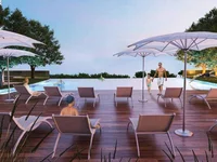 Amenities: outdoor swimming pool with a relaxation area by the water, landscaped gardens, recreation areas surrounded by trees on an open podium, playgrounds, fitness rooms, basketball court, shops.