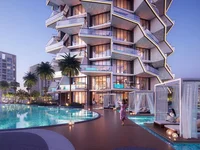 The interior of this 1-bedroom project is distinguished by its exclusive private pool, adding a touch of luxury to the refined living space. Designed to maximize natural light and spatial flow, it features elegant flooring, stylish skirting, and sophisticated wall and ceiling finishes. The kitchen is equipped with high-quality cabinets and a full suite of appliances, including a cooking range, sink, fridge, dishwasher, washing machine, microwave, oven, and ice maker. The bathroom boasts luxurious finishes, including a sink, WC, shower box, bathtub, and jacuzzi. General specifications include premium door materials, curtain walls, and well-appointed wardrobe panels.