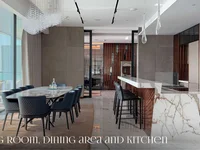 Living and Dining Haven: A luminous expanse with soaring ceilings and floor-to-ceiling windows, seamlessly extending to the poolside terrace. Every detail exudes elegance—from bespoke finishes to harmonious textures—perfect for intimate family retreats or opulent gatherings.