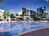 Gemz is a 14-storey pyramid-shaped premium building in the Al Furjan neighborhood. The complex will have 270 apartments, some with private pools. Gemz residential complex is located near a major transportation interchange.