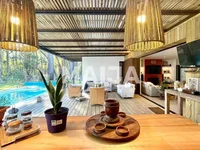 House for sale in Design Village, a beautiful private community in Punta Ballena, a neighborhood located just to the west of Punta del Este. Design Village has an area of 140 hectares (over 300 acres) surrounded by natural beauty in the lee of the sierra and hosts a variety of amenities including security, maid service, gym, spa and a number of outdoor sport facilities. The house for sale is recently constructed on a lot of 1,020 sqm and with 300 sqm constructed area with spacious dimensions. Four bedrooms and four bathrooms, the master bedroom with en suite bathroom, with jacuzzi and a large walk-in closet. The living/dining area has a high-efficiency wood stove/fireplace and lots of glass to be at one with the landscape. It adjoins a large covered wood deck featuring lounge area, dining area and barbecue beside a large heated swimming pool. The kitchen is large, modern and well equipped with top-notch appliances and adjoining pantry and laundry room. All the rooms are air conditioned. Heating in the winter is provided by the aforementioned wood stove which is ducted to the bedrooms as well as zoned electric radiant floor heating. The house is automated with smart devices that control video cameras, the irrigation system, comfort systems, lighting etc.